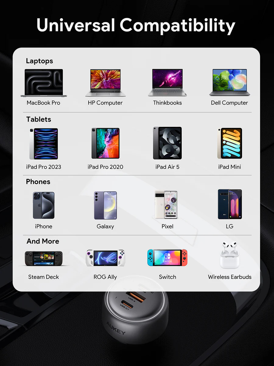 Cocok untuk standar soket 12V / 24V (pemantik rokok) dan kompatibel dengan perangkat apa pun yang diisi daya melalui 1 USB A & 2 USB C