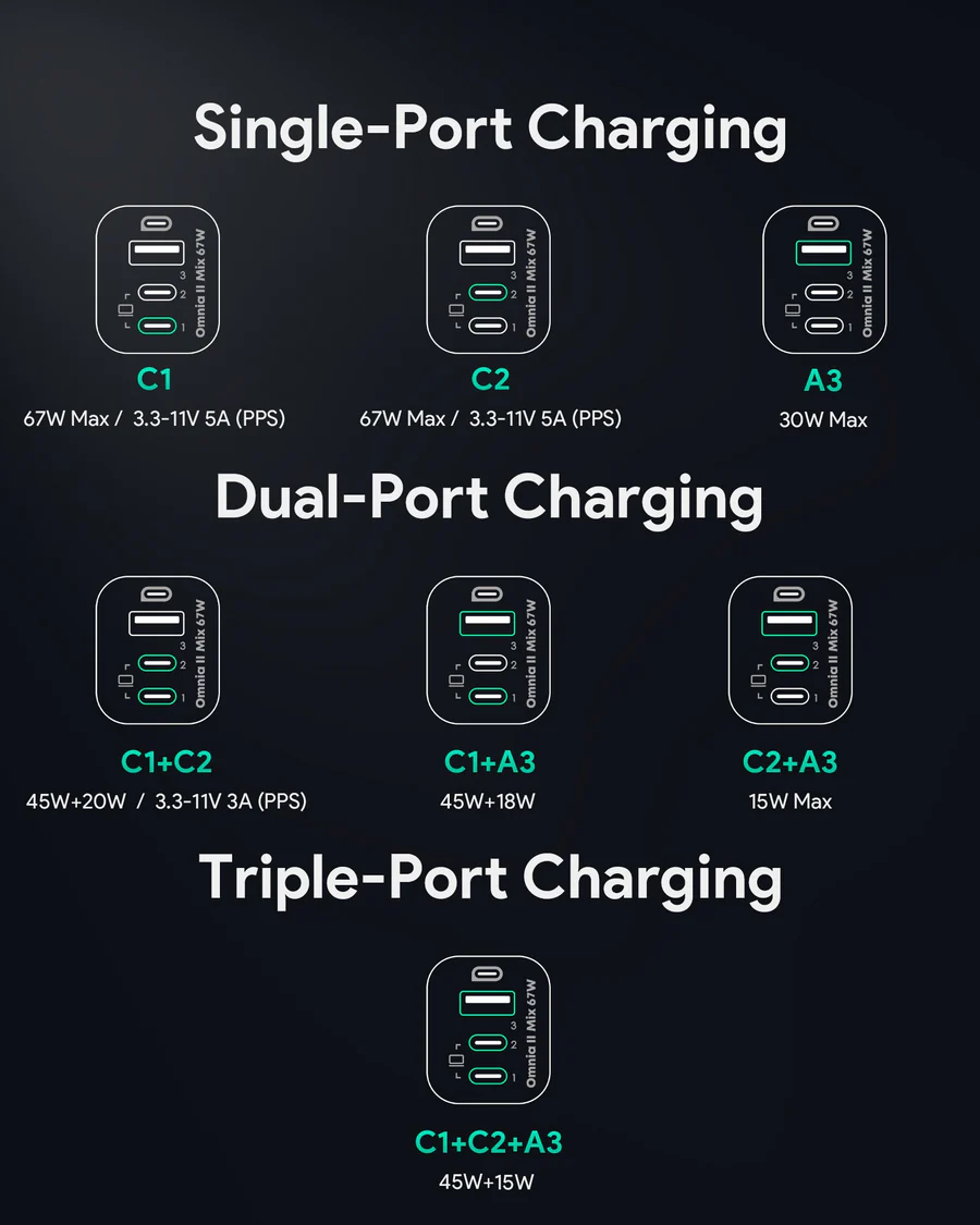 - USB-1(C) + USB-2(C) + USB-3(A)- 45W+15W