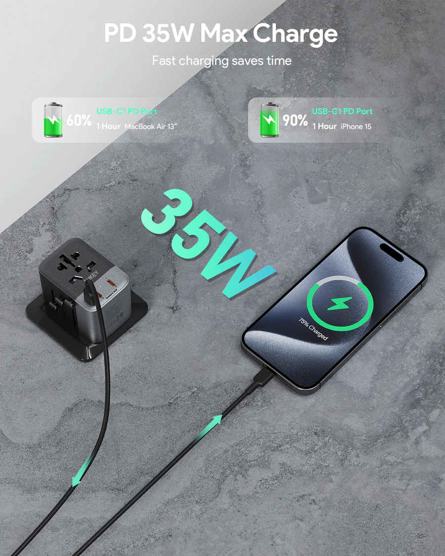 - Single port output : USB-A (1/2), USB-C (3/4) Output : 5V 2.4A (12W Max), USB C (5) Output : 5V 2.4A / 9V 3A / 15V 2.33A / 20V 1.75A (35W Max) PPS 5 – 11V 3A, Multi port output : USB-A (1+2) USB C (3+4), Output : 5V 3A (15W Max) , 2.4A Max per port, USB-C (5) Output : 5V 2.4A / 9V 2.22A / 12V 1.67A (20W Max)