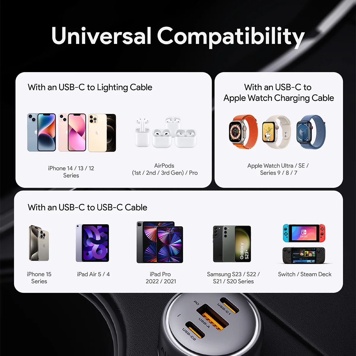 Cocok untuk standar soket 12V / 24V (pemantik rokok) dan kompatibel dengan perangkat apa pun yang diisi daya melalui USB A & USB C
