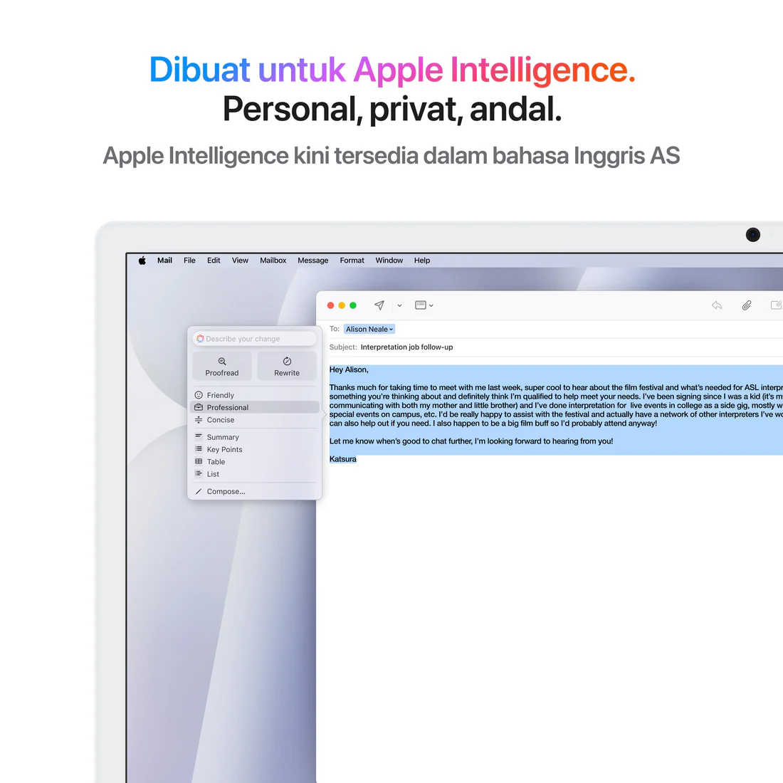 - Layar Retina 4.5K 24 inci, Resolusi 4480 x 2520 Kecerahan 500 nit Warna luas (P3) Teknologi True Tone