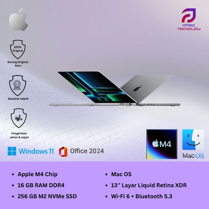 - Tipe Layar :13 inch (diagonal) LED-backlit display with IPS technology; 2560-by-1664 native resolution at 224 pixels per inch, 500 nits brightness, Support for 1 billion colors, Wide color (P3) True Tone technology