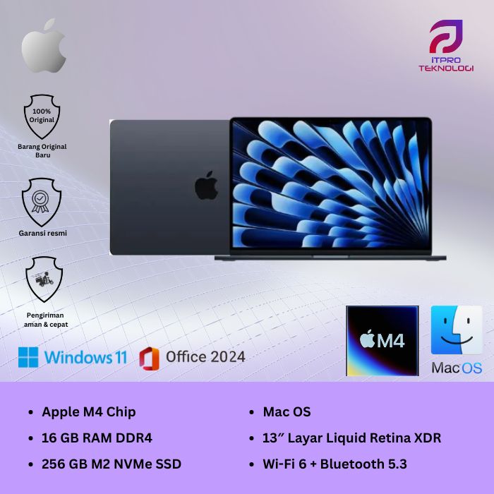 MacBook Air (MW123ID/A) Midnight, 13-inch, Apple M4 chip, 10-core CPU, 8-core GPU, 16GB, 256GB SSD, macOS