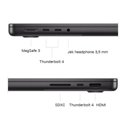- Slot kartu SDXC, Port HDMI, Jek headphone 3,5 mm, Port MagSafe 3, Tiga port Thunderbolt/USB 4
